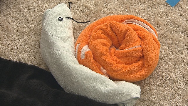 カタツムリの殻は、細長く織ったバスタオルをねじりながら丸めます。
