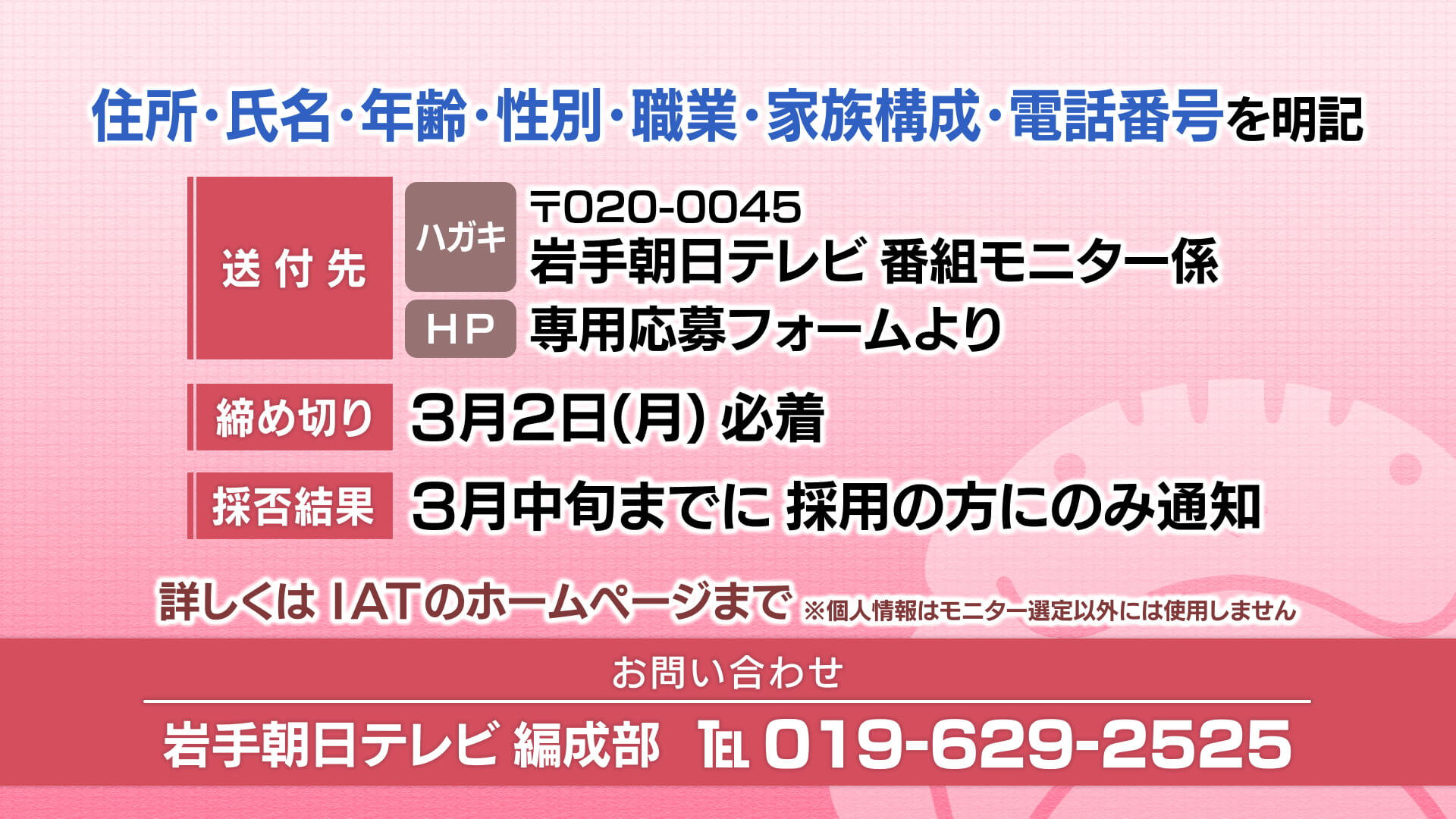採否結果:3月中旬までに採用の方に のみ通知 お問い合わせ:岩手朝日テレビ編成部 TEL 019-629-2525(平日9:30~18:00)