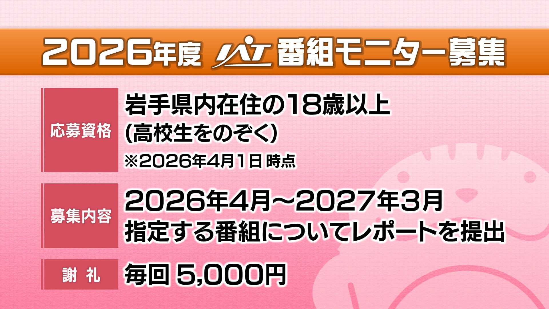 送付先: 【ハガキ】〒020-0045 岩手朝日テレビ 番組モニター係