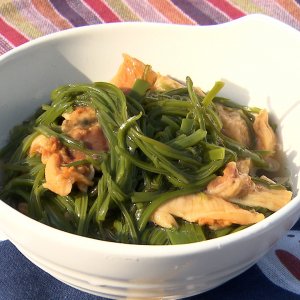 ポイント:にんにくのみじん切りをオリーブオイルで炒めてからホヤを入れ